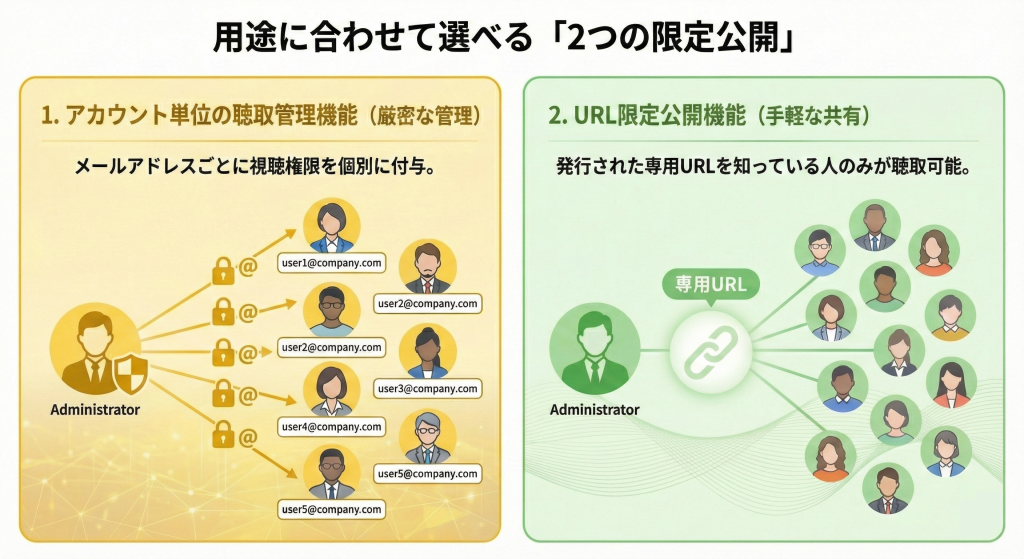 発行された専用URLを知っている人のみが聴取可能。アカウント登録の手間を省き、イベント参加者や期間限定のプロジェクトメンバーへスピーディーに音声を届けたい場合に有効です。